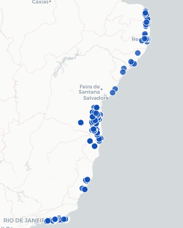 | Bahia (BA) | Almadina, Aurelino Leal, Barra do Choça, Belmonte, Camacan, Entre Rios, Guaratinga, Ibicaraí, Ibicuí, Ilhéus, Ipiaú, Itabuna, Itacaré, Itagibá, Itajuípe, Itamaraju, Itapé, Jussari, Mascote, Mata de São João, Nova Ibiá, Pau Brasil, Piraí do Norte, Porto Seguro, Potiraguá, Santa Cruz Cabrália, Santa Cruz da Vitória, São José da Vitória, Ubaitaba, Ubatã, Uruçuca, Vitória da Conquista | ||